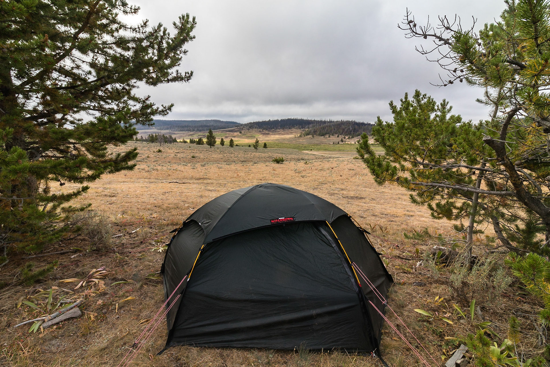 Campers can take a shower at the hotel for $5. I neatly got a large towel, a small bottle of shampoo, body wash and conditioner. All nice and fresh I got a $12 breakfast with fruit, yoghurt, cereal, egg, bacon, sausages, pancakes, orange juice, coffee, everything! With a breakfast like that I can go on for hours. Eventually I went on my way, it was a beautiful route with a lot of beautiful views! After the Togwotee pass there was quite a great descent and then back into the hinterland. On this side of the mountain pass the weather was quite different, cold and a lot of wind. I put on everything I had, inclusive gloves. Luckily there was a lot less wind in the hinterland. At a couple of places the wildfires had done their devastating work. Then a 7 km steep climb, despite the cold I was sweating quite a bit! After that it stayed relatively flat and I arrived at the campground quickly. On the way I encountered a few fisherman, who where fishing for trout in the stream. They where astonisched to see someone in that cold, on a bicycle and wearing shorts. The field I stopped for the night was quite empty and there was almost no shelter from the cold wind. First I changed into some dry and warmer clothes. Then I put up my tent while being watched by a couple of deer. Warmed up 2 cans of spaghetti and had dinner. Got into my tent early, brrrrrrrr……
