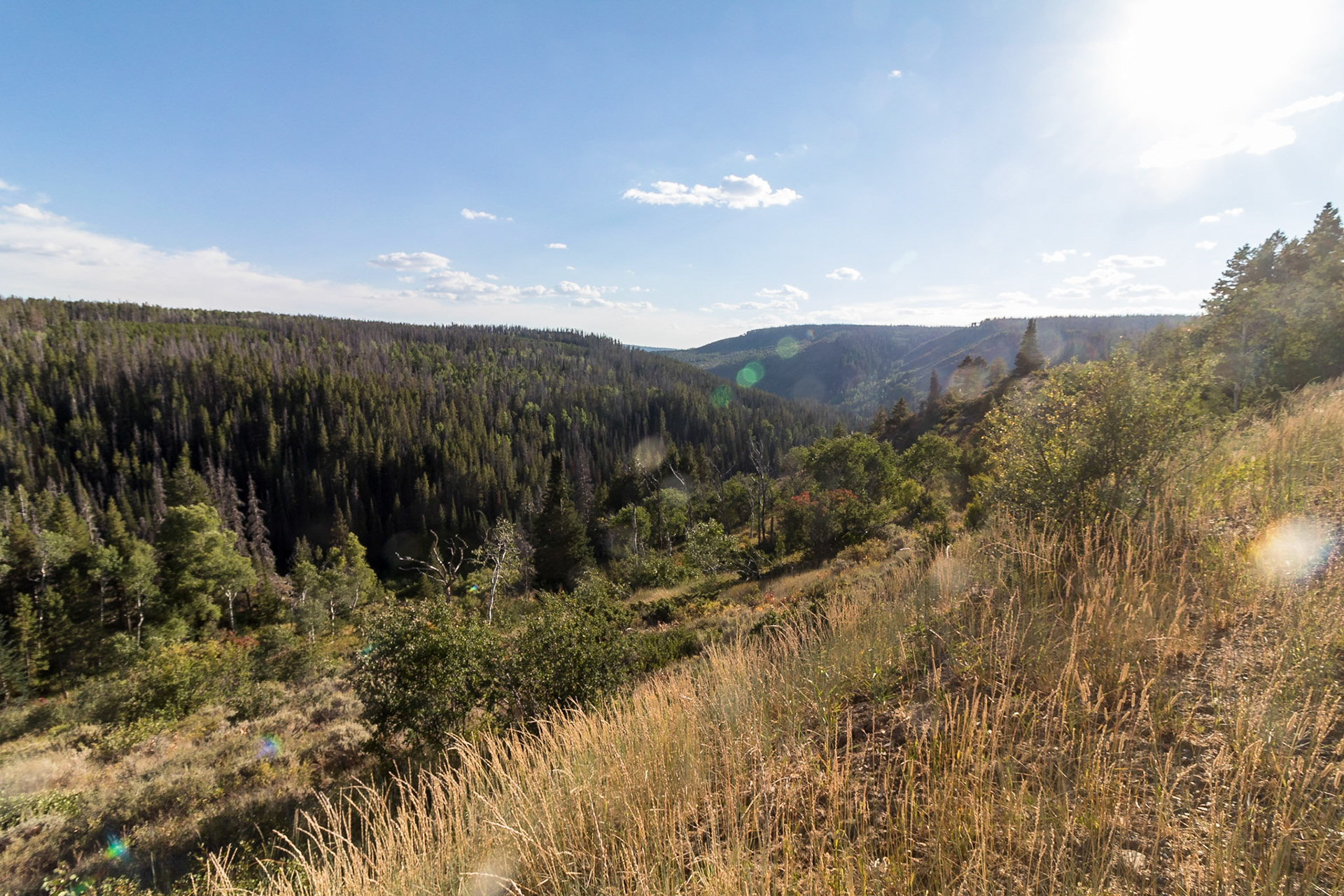 Somewhere around one o’clock or one thirty I meet a young French couple with their son (he just turned 1 last week) who are doing the same tour. They are sitting by the side of the road eating their lunch. I go and sit with them for 15 minutes to exchange experiences and then move on. The little boy has bright blue eyes and looks at you very patient and at ease. He laughs very quickly and easy. He’s having a good time in his special follower behind the bike his parents tell me. Maybe we will see each other tonight at the camping ground we planned? I move on. A hour later two guys pass by me on their off road motorcycles. The first one waves at me (almost all of them do), the second comes to drive next to me and stops for a little chat and gives me water so I can fill my water bottles. His name is Dave, a nice jovial guy. He says; we feel like real tough guys on our motorcycles, until we meet a bicyclist, who is doing the same route… I say; maybe something for next year? :) They are planning to stay at the same campground. So who knows we’ll see each other again tonight. Eventually I see the landscape change gradually, from treeless to one tree every now and then. And then more trees and even more trees. Aspen to be precise, those are real beautiful trees. It’s nice to see some trees again!